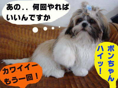 | 備考:2004年6月、小松夫婦がたまたま通りかかった某ペットショップで「処分寸前」のところをタダ同然で引き取られた苦労人。家に入ってシャバを知って間もなくボンのいいおもちゃになる。ろくな食べ物を食べていなかったせいか当初から食欲はすさまじく、ボンの餌まで独り占めにすることしばしば。ボン以外の犬と子供とは仲良く付きあえないが、人が好きで誰にでも愛想を振りまけるのが特技。2013年3月、突然体調を崩し家族に看取られながら10歳で亡くなった。詳しくはこちら。 |