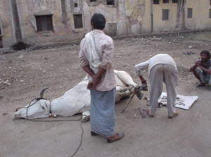 | 牛を解体しているのではありません。蹄に鉄を打っているところ。ヒンドゥー世界では牛は神様の乗るものとして大事にされています。 |